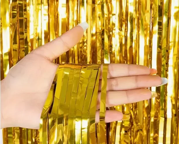 - Креативным решением, которое поможет получить беспрецедентно эффектные инстаграмные фотоснимки или видео, станет фольгированная шторка золото – декоративный элемент, создающий праздничную атмосферу.